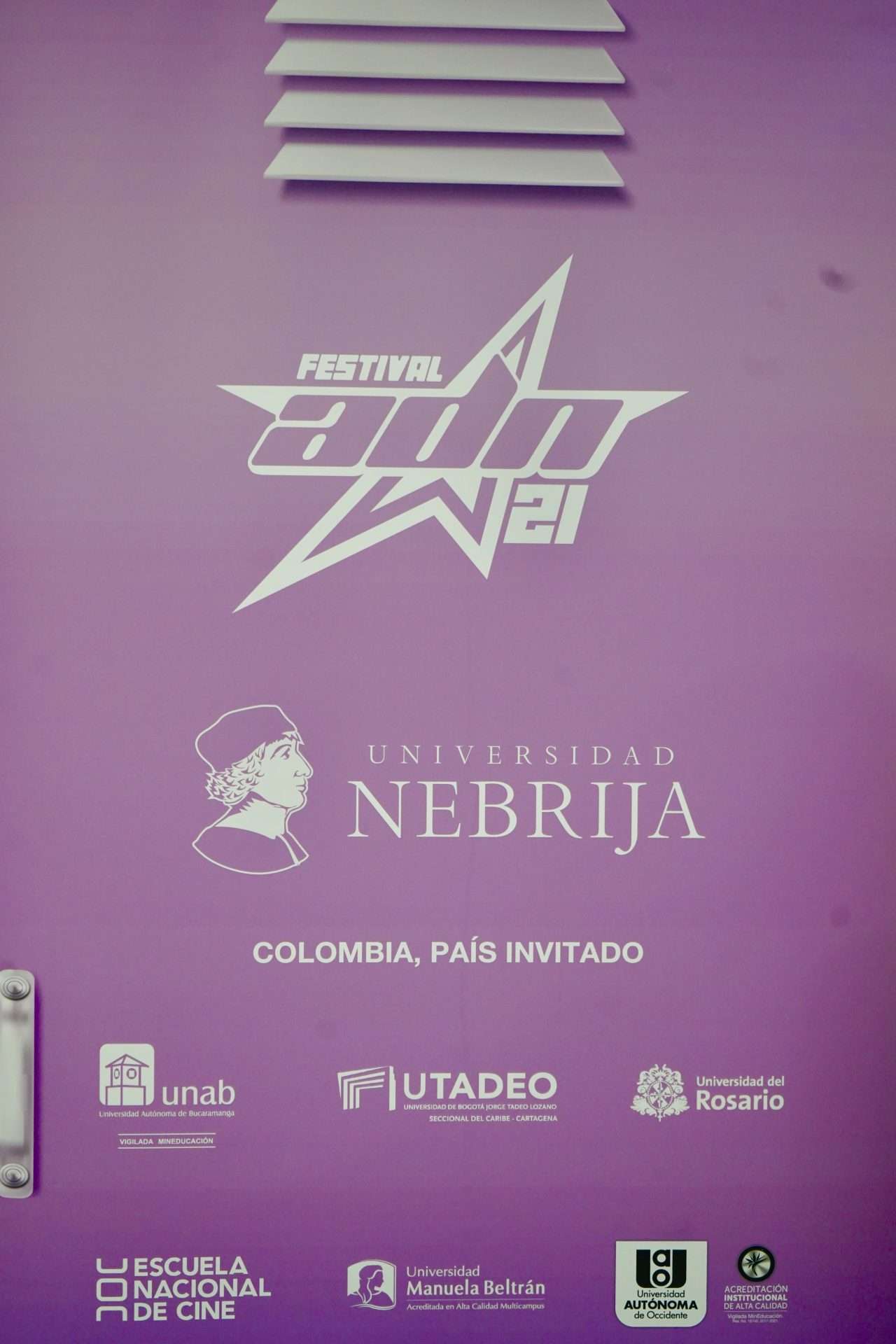 La XXI Edición de AdN, de la Universidad Nebrija, cuenta con el patrocinio de diferentes instituciones y empresas, que se han unido al proyecto para promocionar el joven talento audiovisual y apoyar la cultura. Entre las instituciones: Universidad Nebrija, Academia de las Artes y las Ciencias Cinematográficas de España, Embajada de Colombia en España, Embajada de España en Colombia, ICETEX, Proimágenes, Fundación Casa de México, Egeda y Platino Educa. Las marcas que apoyan el Festival son Bitprom, Trigraphics, Tipos Infames, Canon, Music Library & SFX, Fantasy Line Productions, Advenire Films, Vanille, Biccom y Filmin. Se unen los medios colaboradores 20 Minutos, Vibra Latina, Cinemanía, Previously y Filmados.